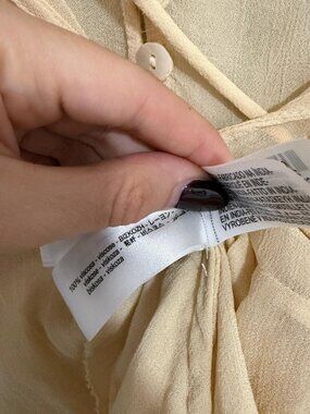 Shirt made from spun viscose. Round neck and adjustable v-neck with ties. Long sleeves with flared cuffs. Matching fabric ruffle detail. Button-up front.
