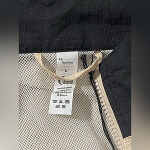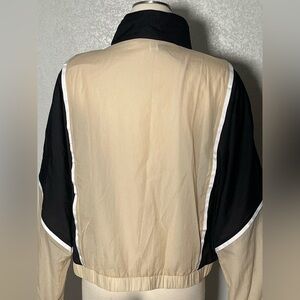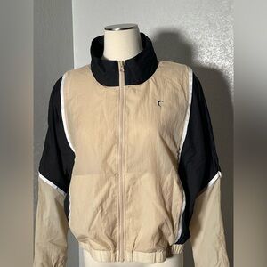 Stylish beige and black zip-up jacket with a sleek design. Features a subtle logo on the chest.