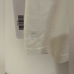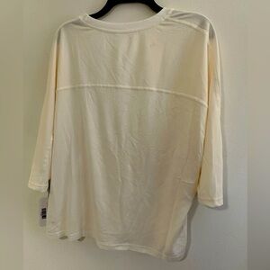 New with tags ZYIA Active boyfriend lounge top in cream. Features a mesh upper with knit lower section and sleeves, crew neck, and three-quarter length sleeves. Made from a soft rayon-poly blend in a slouchy style.