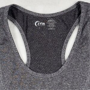 ZYIA Active Grey Fog Copper Charged fitted athletic tank top. In excellent condition! Scoop neckline. Sleeveless. Fitted style. Racer back with ZYIA logo. Dark heather gray color. Size large. 60% nylon, 36% polyester, 4% copper Measurements provided in photos