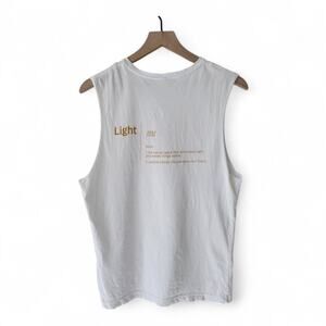 Cotton muscle shirt with definition of light on the back and gold rainbow on the front. Could be worn casual with jean shorts or for workouts with leggings.