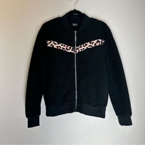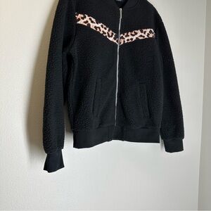 ZYIA Flying V Fleece Teddy Sherpa Jacket Full Zip Black Leopard Size S Women’s
