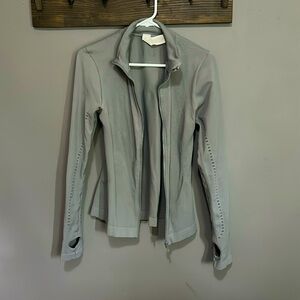 Only worn a couple times. Grey. Nylon and spandex material. Nice light jacket, perfect for walks and/or runs or just everyday errands.