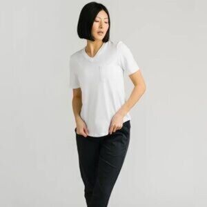 Classic white tee with a comfortable fit. Features a stylish V-neck and short sleeves. Perfect for casual wear.