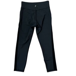 Black 7/8 leggings. Mesh panels along sides of legs. Reflective stripes on front.
