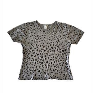 ZZ Silk Medium Sweater Cashmere Blend Animal Print Short Sleeve Black Gray. Approx. measurements lying flat, underarm 18.5", back of neck to hem 19", shoulder to shoulder 15".