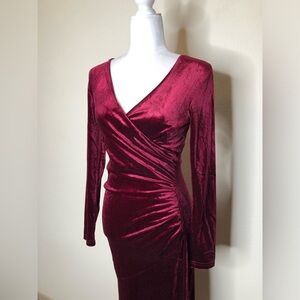 Zaberry Wine Red Velour Velvet Wrap Stretch Mermaid Midi Dress Valentine’s Day