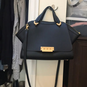 Zac Zac Posen Black Leather Purse with brass fastenings in great condition. The purse has a whimsical envelope shape, like the bag has been unfolded. A wonderful twist on a classic simple bag.