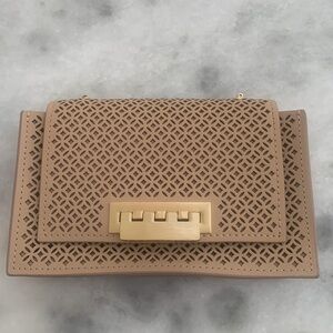 Add a touch of luxury to your collection with this Zac Posen Earthette Clutch. This designer handbag features a laser-cut leather flap and an oversized blending elegance with modern sophistication.