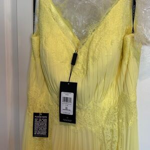 Chic light yellow dress with lace accents. Ideal for elegant events.