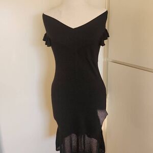 Shimmery Black knit off the shoulder dress. Reminiscent of the bandage dress, Zac Posen for Target. Sheer ruffle accent at shoulder and sheer panel at hem.