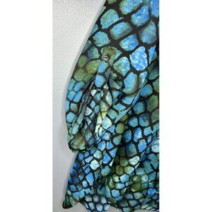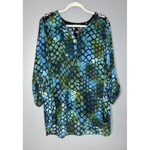 Zac & Rachel Lightweight Blouse Womens 2X Blue Green Black Lace Trim Tunic Top Button Tab 3/4 Sleeve with a unique print
