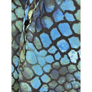 Features an abstract blue, green, and black pattern resembling a reptile or mosaic design.