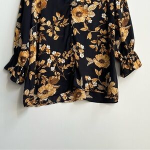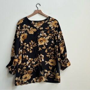Zac & Rachel Button Down Loop Satin Blouse Plus 1X Black Gold Floral $48 Ruffle