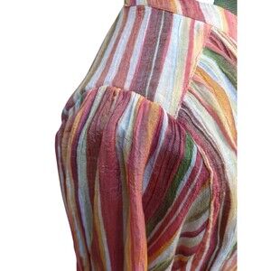 Style tags: x-large, stripes, funky, fun, pink, orange, puff sleeve, 3/4 sleeve, brunch, mature, colorful, V-neck, travel, stripey
