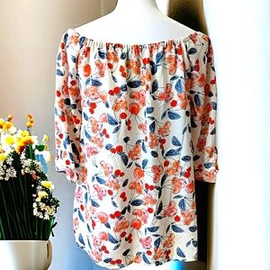 Elevate your wardrobe with this charming floral cherry print off-shoulder blouse. Featuring a delicate ruffle detail along the neckline, this top is adorned with a beautiful print of peach and coral cherries with blue leaves on a cream background. The lightweight fabric and three-quarter sleeves make it perfect for spring and summer outings. Pair it with your favorite jeans or a skirt for a fresh, feminine look.