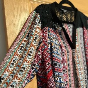 Excellent preowned condition. Colorful patterned long roll tab sleeve collared split neck lightweight blouse. Has black sheer lace on shoulders. Cuffs buttons. Lace is cotton/nylon, the rest is polyester material.