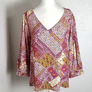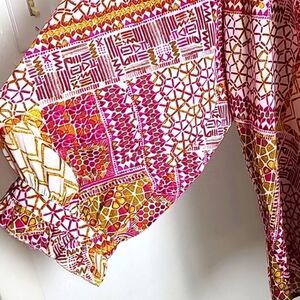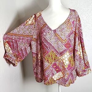 Zac & Rachel Colorful Print Top, Wide Balloon Sleeves, Pink,White,Gold, Size XL