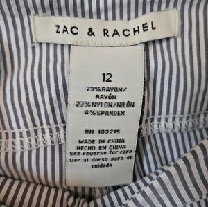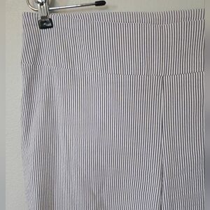 They feature a white and blue pinstripe pattern and decorative button details at the hem. They're made of a stretchy seersucker type fabric.