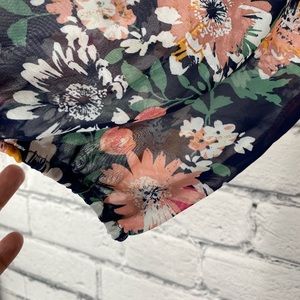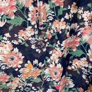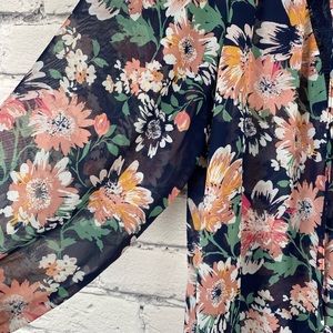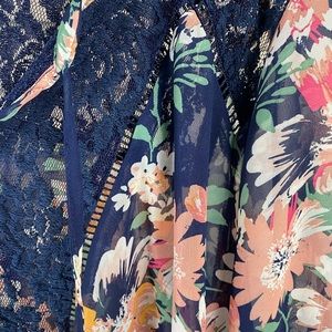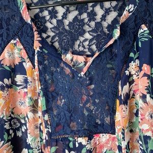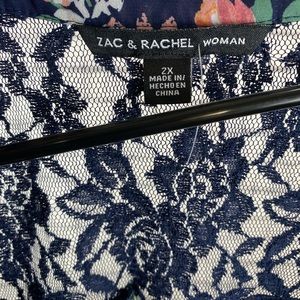 EUC Zac and Rachel boho inspired floral top size 2X. This top is a flowy rayon top primarily in navy with pink flowers with pops of green and orange. There is inlaid navy lace around the neckline and top of the shoulders. There are also two long tassels in the front with a small silver bead in the end. The sleeves are 3/4 length balloon sleeves