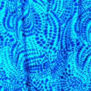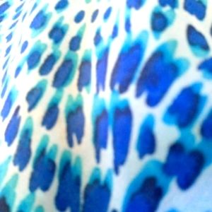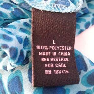 turquoise blue abstract pattern 100% polyester chiffon texture. elastic neckline, sleeves and bottom of blouse. keyhole in back of neck.