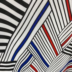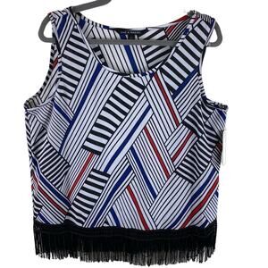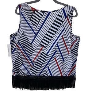NWT. Sleeveless round neck multi color geometric pattern lightweight blouse with black fringe along hem. 100% polyester. Approx. measurements: Shoulder to hem 24”, pit to pit 22”. Size L.