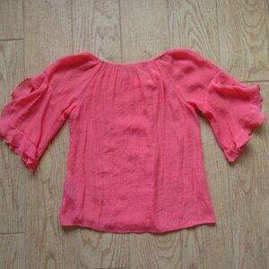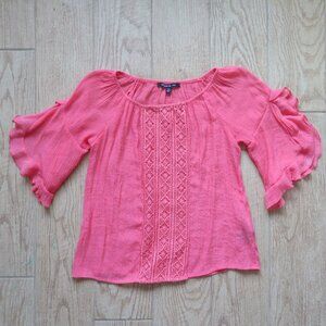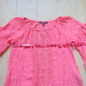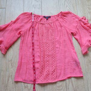 Zac & Rachel pink bohemian peasant top with crochet embellishment on the front. Pullover style, relaxed fit. Flutter sleeves. Color is a salmon pink. Sheer and unlined. The material does not stretch. 65% polyester, 35% rayon. Crochet is 100% cotton. Size PS (petite small).