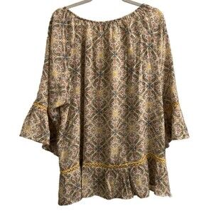 The Zac & Rachel Plus Boho Peasant Prairie Gauze Blouse Tunic Top in size 2X is a stylish and versatile piece perfect for various occasions including travel, parties, casual outings, and business meetings. The blouse features a floral pattern, 3/4 bell sleeves, a scoop neckline, and a pullover closure for easy wear. Made from a lightweight polyester blend fabric, this bohemian-themed top offers a relaxed fit and comes in a vibrant multicolor design with accents of ruffle and crochet lace details. Ideal for summer, fall, and spring seasons, this blouse is easy to care for with hand wash only instructions.
