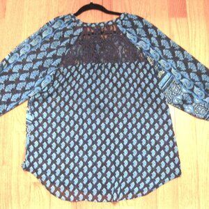 Zac & Rachel Size Large Navy Lace Trim Sheer Lightweight Chic 3/4 Sleeve Blouse