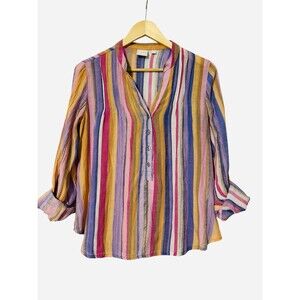 Beautiful lightweight striped multicolor button-down blouse in excellent used condition. Features roll tab sleeves, or can be worn as long sleeves. Super comfortable