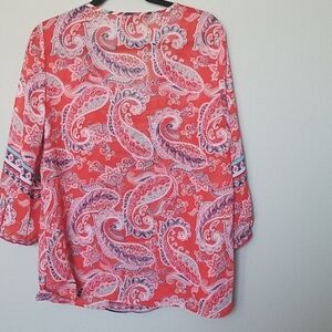 So colorful! Lightweight sheer fabric, no stretch. Tie option feature at chest. Paisley floral print. Excellent condition. Smoke free home. Sleeves are 3/4 length.