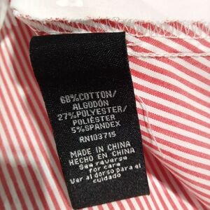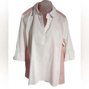 This Zac & Rachel top features a crisp white front with contrast red-and-white vertical stripe panels at the back and sides. Designed with a partial button-front placket, collar, and roll-tab 3/4 sleeves, it’s perfect for both casual and office-ready looks. Relaxed fit and lightweight fabric provide all-day comfort with a modern twist.