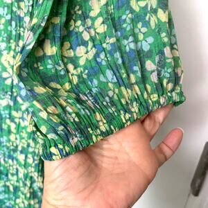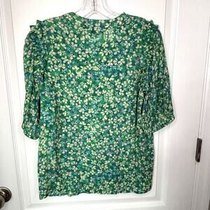 Zac& Rachel Wms M Green Floral Button Front Gauzy Top Ruffle Trim Cottagecore