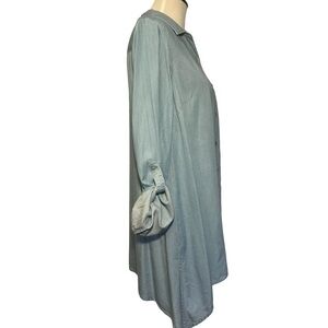 Blue chambray Zac & Rachel button front adjustable tabbed sleeve. Asymmetrical side split hem. 100% Lyocell beachy, coastal grandma, bohemian, lightweight, see photos for approximate measurements.