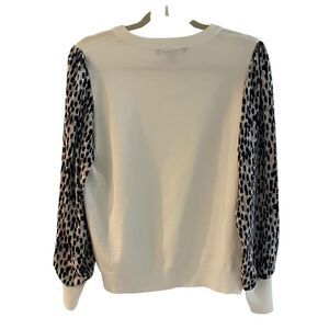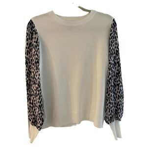This new without tags white sweater with animal print sleeves is by Zac & Rachel. The mixed media top has a sweater bodice and silky near sheer like sleeves. The sleeve print almost looks like it could be a cheetah or leopard type print. The top is a women’s size medium. So cute!