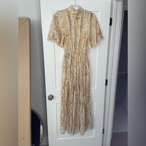 This shimmery high-neck dress is softened by a blouson bodice with slender ties in back, fluttery sleeves and delicate flowers dotting the metallic fabric