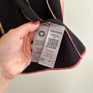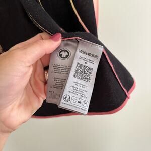 Details: Zadig & Voltaire Austin Cosmo Open Front Long Sleeve Ombre Cardigan - Size: M (Sold out online @ Bloomingdales!) - Color: Gray/Pink- Material: 90% Cotton, 10% Polyamide- Features: Open front, knit, long sleeve, raglan sleeve, side slit, graphic print back, hand wash, pockets, comfort, breathable, casual.