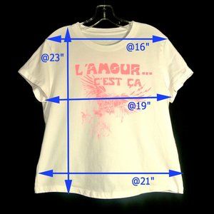 This T-shirt by Zadig & Voltaire was worn once and is in excellent used condition. No stains or holes, It's a "Skinny" size Large. Please check my measurements in the final photo to make sure it will work for you. It's a nice weight T, and the printing is in the same condition as it arrived. Sold out everywhere, it's just a bit too Skinny for me! Neon pink writing on front says "Love is that (it)".