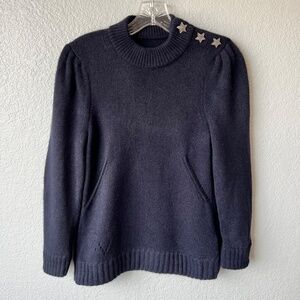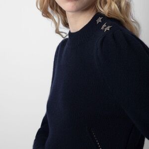 * Features: soft and cozy 100% cashmere sweater with 3 star shaped diamanté buttons on shoulder, long sleeves with ribbed cuffs, pullover style, round ribbed neck, knitted raised waistline detail and ZV open weave logo on lower front of sweater. Shoulder has gently gathered and puffed sleeves. FA23 collection
