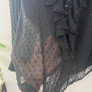 Zadig & Voltaire Black Twin Mousseline Sparkle Long Sleeve Blouse Size XS. Black with rainbow sparkle texture. Button up. Sheer material - great layering top or can be worn for a night out. Ruffle detail at center of chest. Relaxed fit.