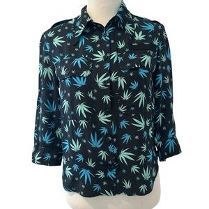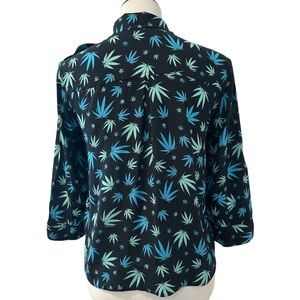 Chic shirt with a black and blue leaf design. Crafted from soft viscose. Button front three quarter sleeve with novelty blue and green leaf print on black background.