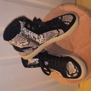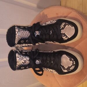 Stylish high-top sneakers with a snake print design. Features black and cream tones. Perfect for casual wear.