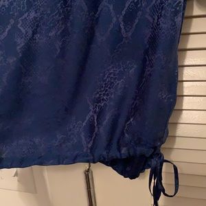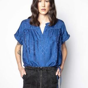 Elegant blue blouse with subtle pattern. Short sleeves and relaxed fit. Perfect for casual or formal wear.