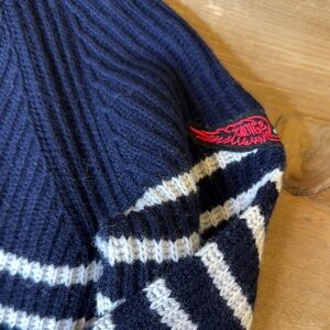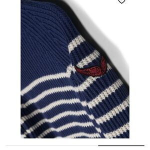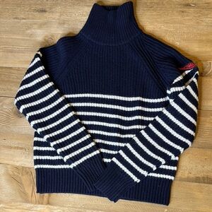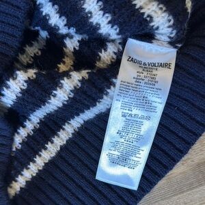 Embrace a timeless nautical style with this Zadig & Voltaire sweater, featuring a classic turtleneck and elegant blue and white Breton stripes. Crafted from a soft knit material, it offers a cropped length and ribbed cuffs for a chic, casual look. Perfect for adding a touch of sophistication to any outfit.