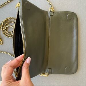 Stylish leather crossbody with gold chain detail. It’s beautiful and slightly used. Perfect condition. Perfect for a gift or for yourself to wear everyday