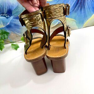 Tags: Casual, strappy, block heel, luxury, spring, summer, fall, designer, preppy, gladiator, boho, bohemian, gold-tone, open toe, double buckle fastening, branded footbed, mid block heel
