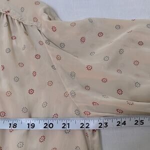 Details: Discoloration spots on sleeve, missing last button, No size tag, pls see measurements (seems like a S) No material tag feels like silk, embroidered Sun and Moon, side hem slits, 3/4 button sleeves, semi sheer, cream Color with blue and red