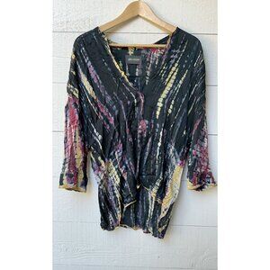 Tie-dye split neck top with 3/4 dolman sleeves, buttoned cuffs, and side slits near the hem.