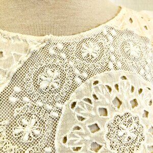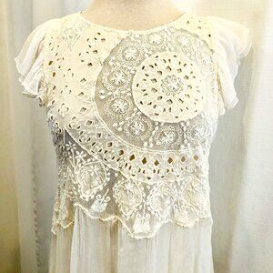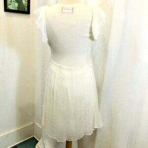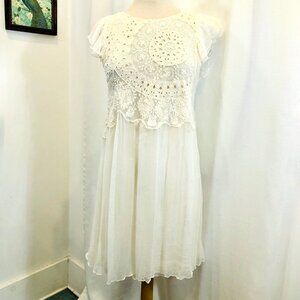 Pretty and ethereal layered ivory translucent dress with double layer short flutter sleeves. Slightly A-line shaped skirt that's double layer also. Front bodice has a doily / lace patchwork detail. Skirt is lined with a slightly thicker woven fabric. Top layers are of a very lightweight ivory crinkle / textured chiffon woven. Bottom of skirt has a lettuce hem / wavy look. Manufactured by Zadig & Voltaire and made in India. Bodice front is cotton / viscose blend, and main dress is viscose. Lining is a viscose / cotton blend. In good condition, looks hardly worn. Nice for a Summer party or event!