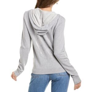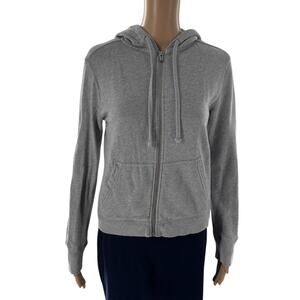 Comfy Skull Metal Stud Skull Zip Hoodie in gris chine with drawstring hood, a divided kangaroo pocket, and rhinestone embellishments at the back. Long sleeves. Full zipper closure at front. 70% cotton, 30% modal. Machine wash. In preowned condition, some minor fabric wear inside the hood.